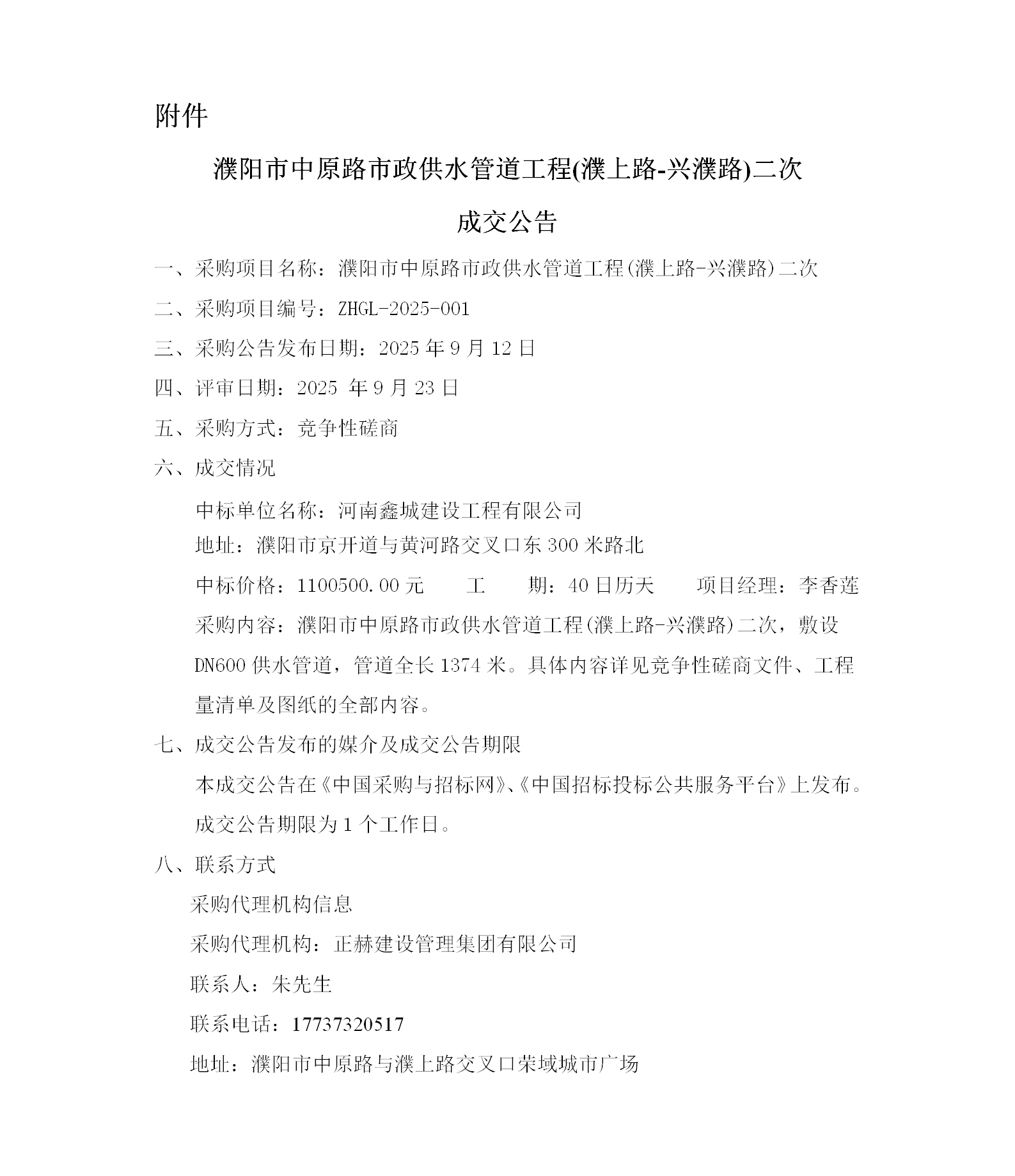 濮阳市中原路市政供水管道工程(濮上路-兴濮路)二次成交公告